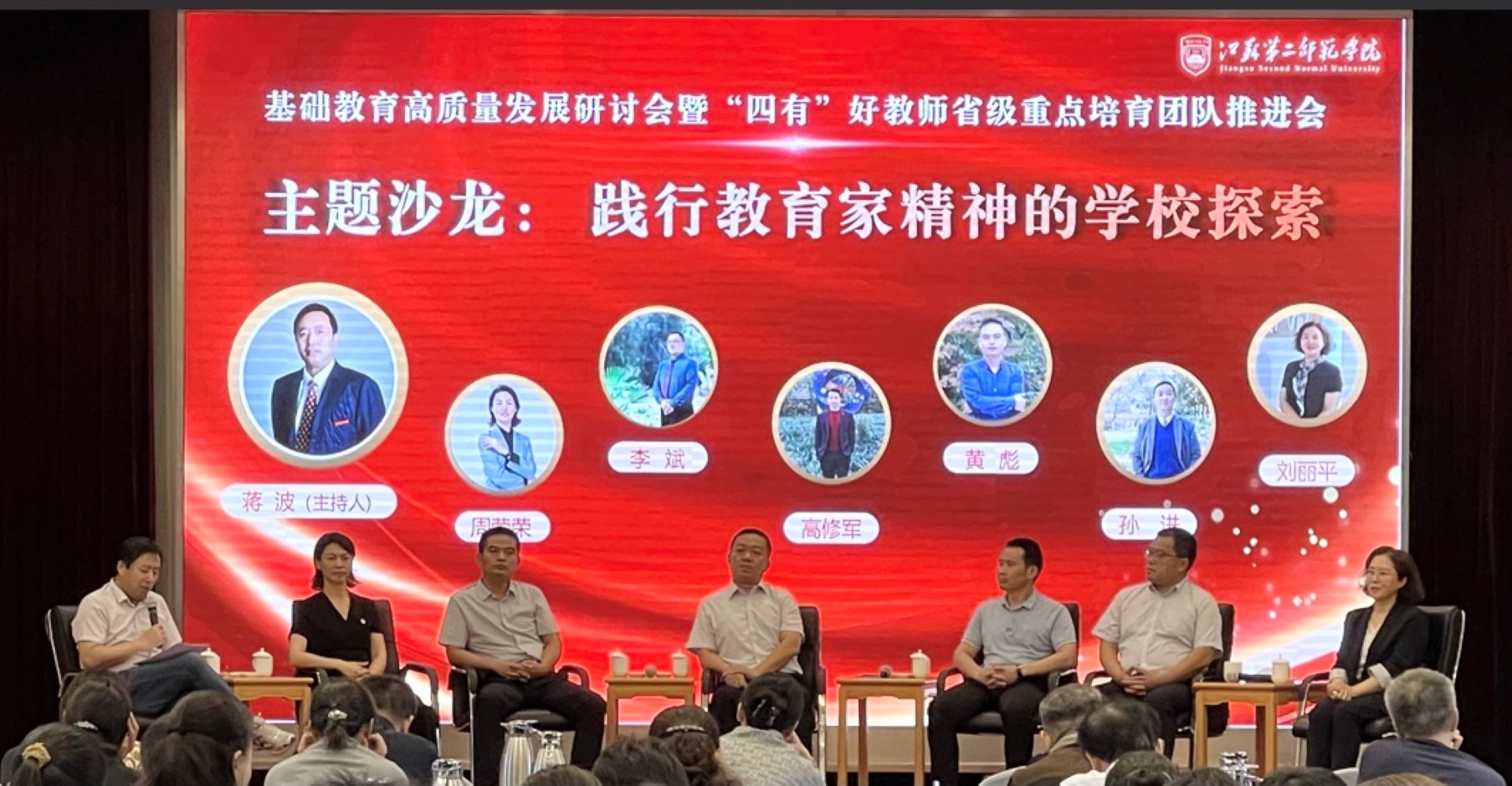 活动第四议程由蒋波主持。在沙龙对话环节,南京市大厂实验幼儿园党支部书记、园长周荣荣,泰州市第三高级中学党委书记李斌,邳州市南京路小学党支部书记、校长高修军,扬州市邗江区实验小学党支部书记、校长黄彪,南京市雨花台初级中学党总支部书记孙进,无锡市第三高级中学党委书记刘丽平等人以“践行教育家精神的学校探索”为主题展开对话,蒋波进行点评。各位嘉宾就教育家型教师的画像、培养举措、创新型教师的成长路径、“四有”好教师的培养秘诀等相关问题进行了深入探讨,并结合学校的实践经验阐述了自己对于理想信念、道德情操、育人智慧、躬耕态度、仁爱之心和弘道追求的理解。蒋波最后做点评总结,他认为教育家型教师应具备思想性、师范性和学术性,强调教师要以教育家精神引领,通过不断规划、勤奋、积累和精进以努力成为“四有”好老师、教育家型教师。