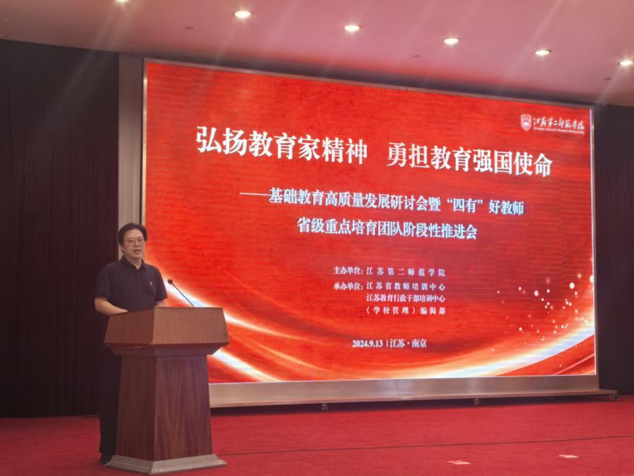 为深入学习贯彻党的二十届三中全会精神,认真落实习近平总书记在全国教育大会上的重要讲话精神,大力弘扬教育家精神,持续推进新时代高素质专业化教师队伍建设,2024年9月13日,由省师干训中心和《学校管理》编辑部承办的“弘扬教育家精神 勇担教育强国使命——基础教育高质量发展研讨会暨‘四有’好教师省级重点培育团队阶段性推进会”在南京举行。