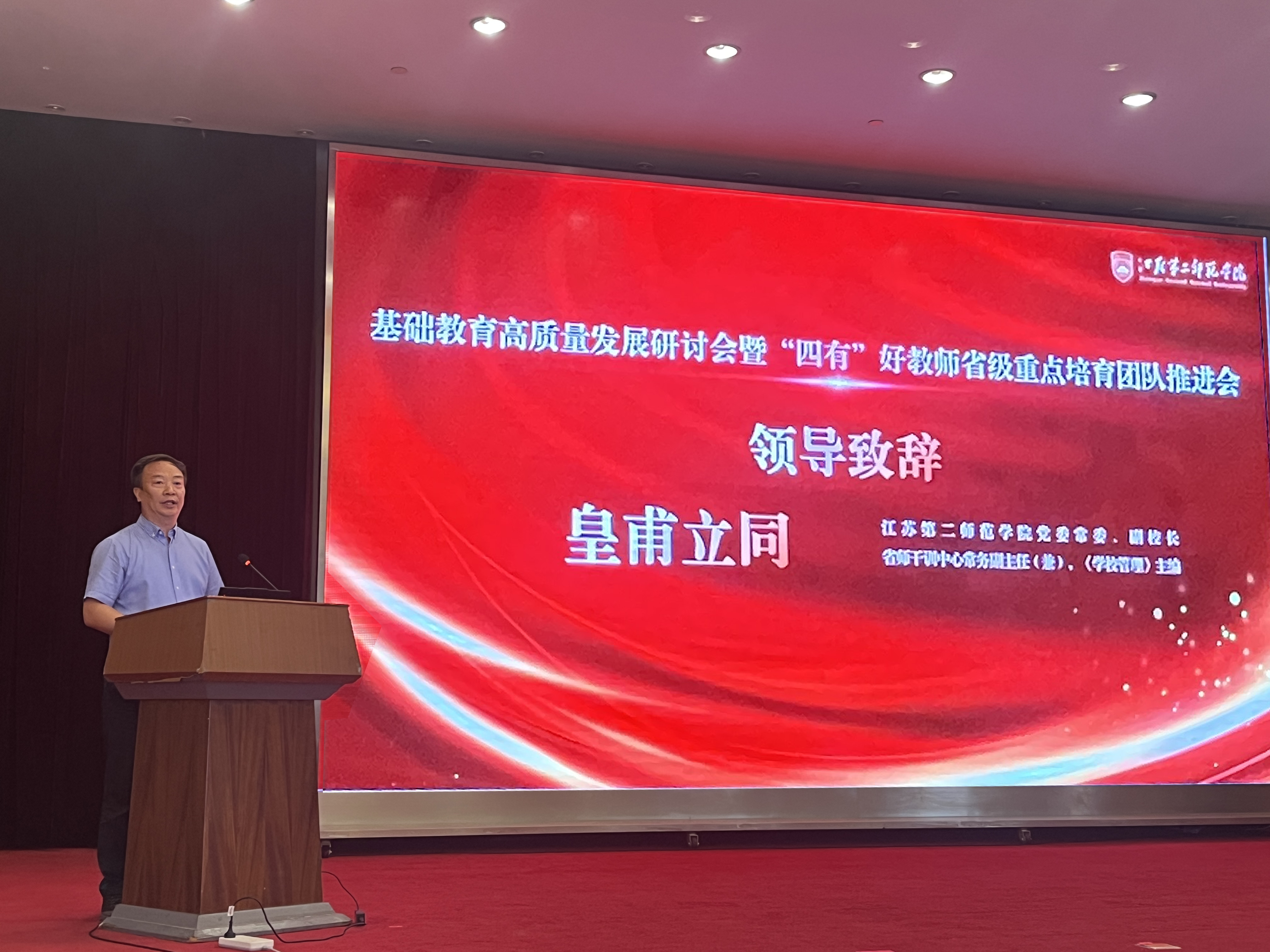 会议伊始,皇甫立同致欢迎辞。他对各位领导、专家和一线教育工作者的到来表示热烈欢迎。皇甫立同表示,今年是新中国成立75周年,恰逢第40个教师节,会议要深刻把握二十大报告对新征程教育事业提出的要求,密切关注校长教师专业素养的提升,积极回应新时代基础教育高质量发展需求。基于此,他向与会人员分享了以下四点想法:一是坚定信念,做教育家精神的传承者。教育工作者要深入领会和准确把握教育家精神的丰富内涵和实践要旨,树立终身学习的理念,保持教育初心,将教育家精神作为职业追求,把教育家精神转化为内在的思想自觉和行动自觉。二是守正创新,做教育改革的先行者。教育工作者要积极顺应科技革命深入发展、数字技术广泛应用的时代趋势,适应新课程标准、新教材内容、新高考模式的教育改革形势。省师干训中心要充分发挥国家级名校长培养基地的资源优势,进一步完善教师专业发展支持体系,为基础教育高质量发展培育更多优秀的教育管理者。三是凝练成果,做教育实践的传播者。广大教育工作者可以借助《学校管理》杂志这一平台,就教育管理、课程改革、教师发展等方面积累的成功经验和创新做法进行深入交流与合作。省师干训中心也应当利用江苏教师管理系统、江苏师干训公众号、《学校管理》杂志等媒体,传递教育改革信息,讲好江苏教育家故事。四是师道尊严,做引领教师发展的探路者。教育工作者要严格遵守教师职业道德,将教育家的奉献精神、育人精神和创新精神作为行动旗帜,不断提升个人素质与管理能力,为教师队伍的发展和学校教育质量的稳步提升贡献智慧与力量。