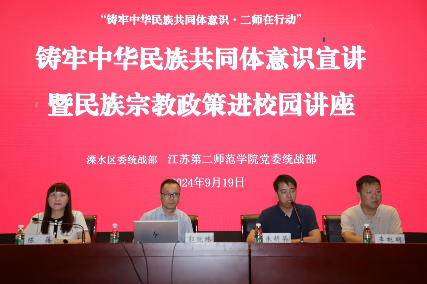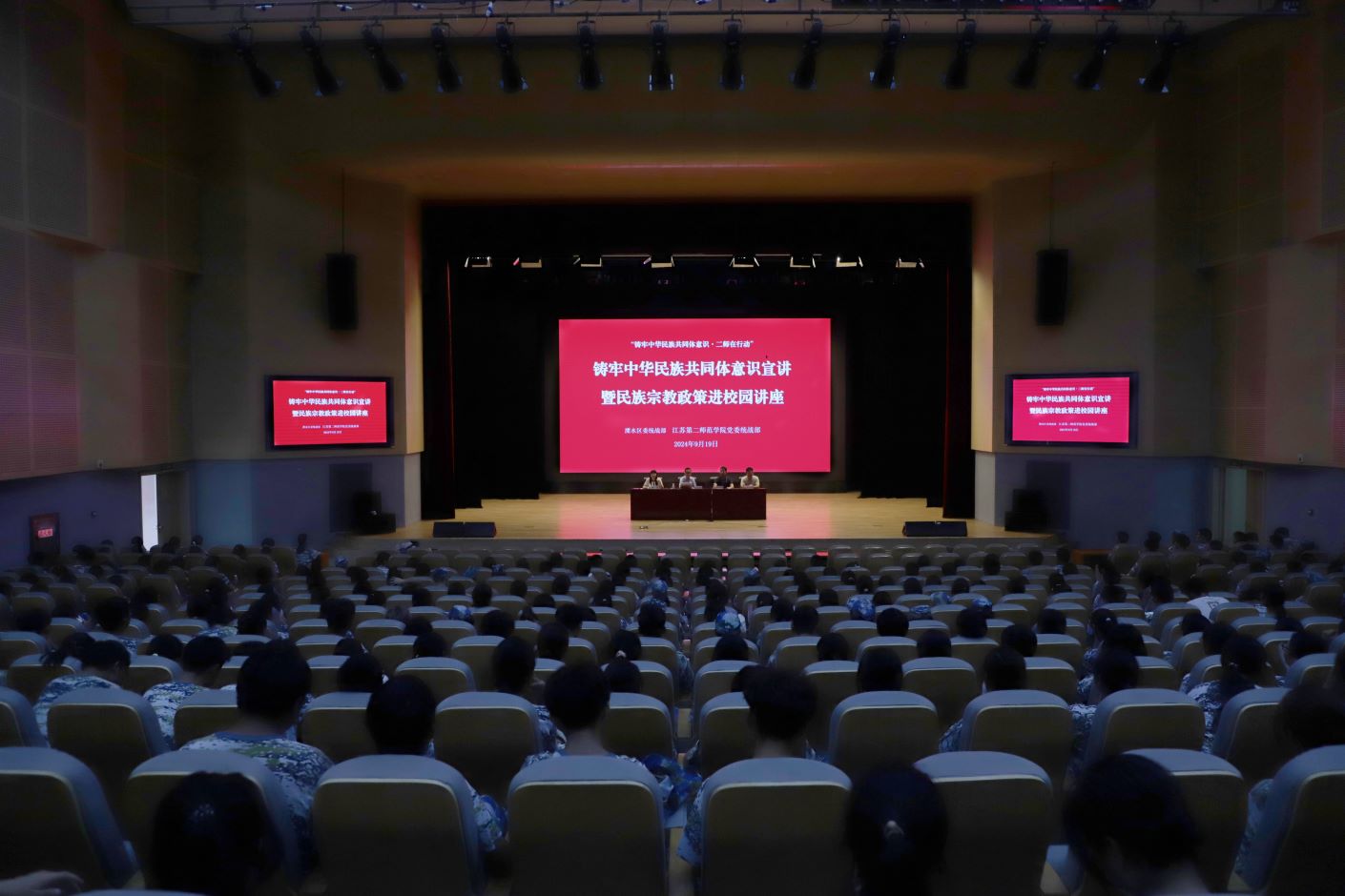 9月19日上午,我校党委统战部与溧水区委统战部在石湫校区尚美楼二楼报告厅共同开展铸牢中华民族共同体意识宣讲暨民族宗教政策进校园专题讲座。扬州大学文化传承与创新研究院院长、扬州大学中华民族口头传统研究中心特约研究员郭院林作了题为《以文化认同铸牢中华民族共同体意识》的专题讲座。讲座由党委统战部部长陈蓓主持,溧水区委统战部民族宗教工作科朱胡荣、溧水区民宗局李桃明出席本次活动,全校600余名2024级新生代表参加活动。