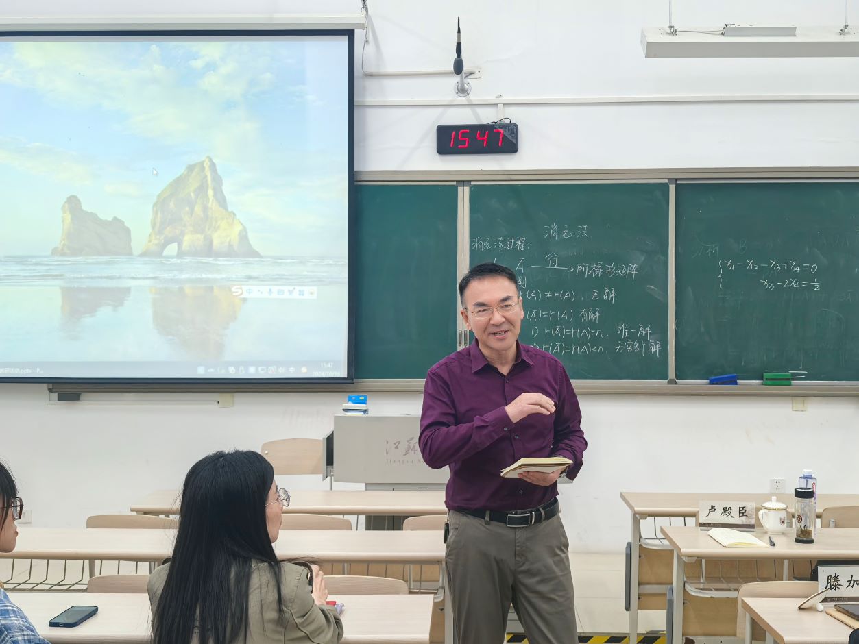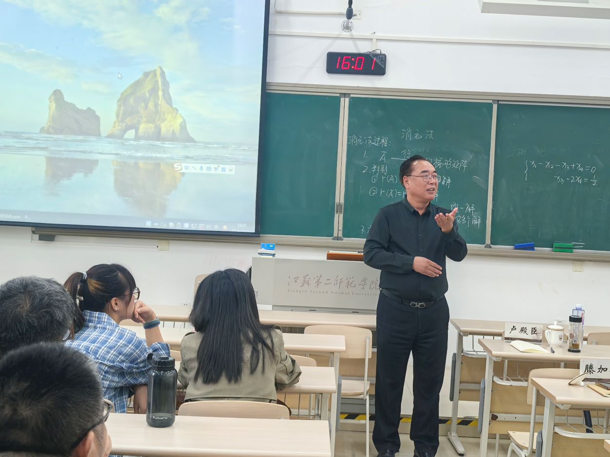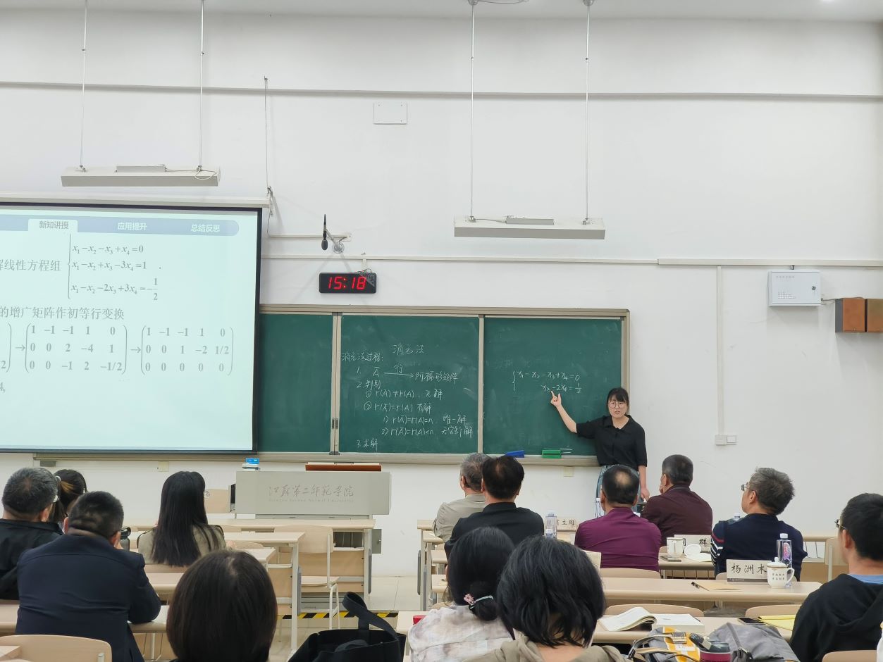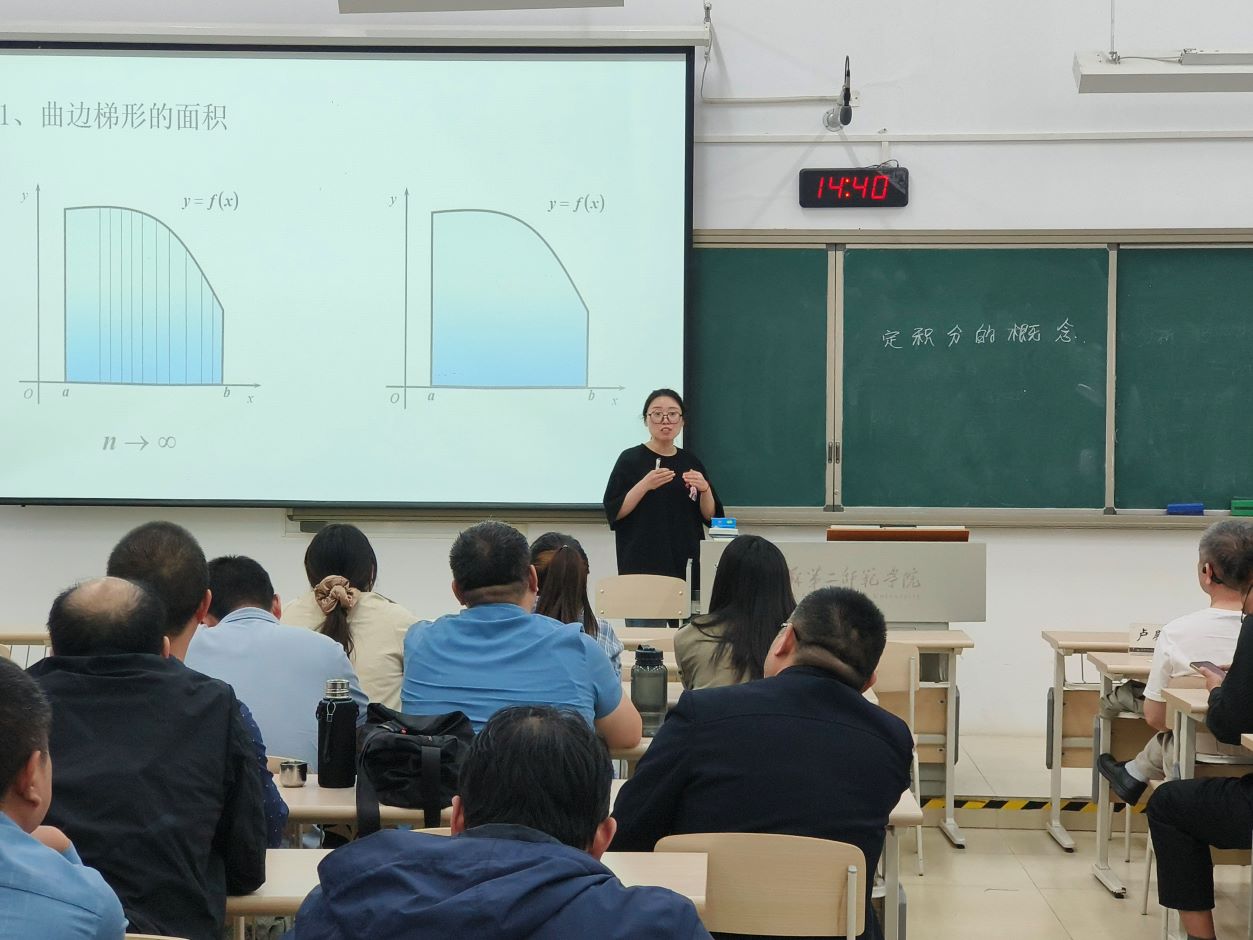 而后,两位青年老师乔妍、姜美美还进行了高等数学、线性代数课程内容的教学展示。乔妍以“定积分的概念”为题,以曲边梯形的面积求解为引导,详细介绍了定积分的定义,并通过定义引出了相关的性质。姜美美讲课内容为“消元法”,从中国古代数学典籍九章算术中方程的解法出发,引出阶梯型矩阵,展示数学的魅力与重要性,激发学生深入探究学习的热情。