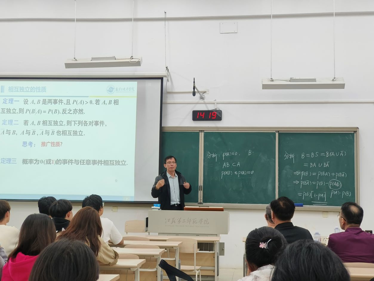本次同课异构教研活动的课题选自《概率论与数理统计(李长青版)》第一章第五节《事件的独立性》的内容,由学院张晶老师和南京信息工程大学杨洲木老师分别讲授。两位老师经精心准备,展现了各自独特的教学风采和理论功底。