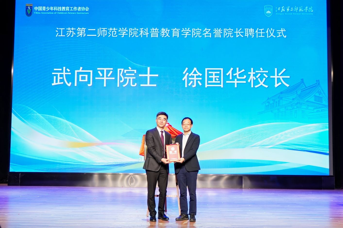 中国青少年科技工作者协会理事长、中国科学院武向平院士,中国青少年科技工作者协会副理事长、秘书长赵崇海,江苏省科学技术协会二级巡视员王小峰等,江苏省青少年科技教育协会理事长、南京师范大学原党委书记宋永忠等嘉宾出席了开幕式,开幕式由中国青少年科技教育工作者协会科学教师教育专委会主任、重庆师范大学林长春教授主持,我校徐国华校长出席开幕式并致辞。开幕式上,武向平院士和徐国华校长为新成立的由我校和江苏省青少年科技教育协会校会合作共建的江苏第二师范学院科普教育学院揭牌,徐国华校长向武向平院士颁发了学院首任荣誉院长聘书。武向平院士还受邀在开幕式上为主会场的参赛选手和分会场的我校师生做了题为《宇宙的远方》精彩学术报告。