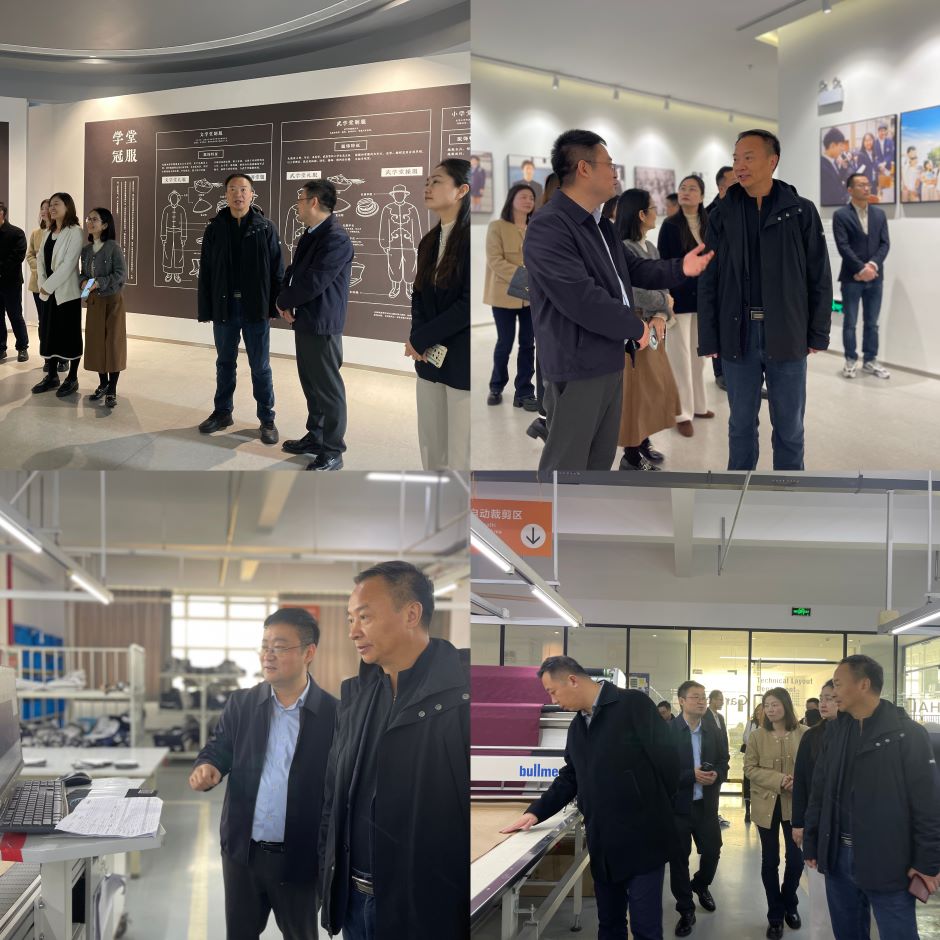 皇甫立同一行参观了公司校服展览馆和智能生产车间,详细了解国内外校服发展沿革、主要国家校服特点和现代校服生产流程。