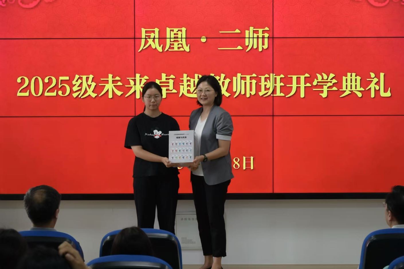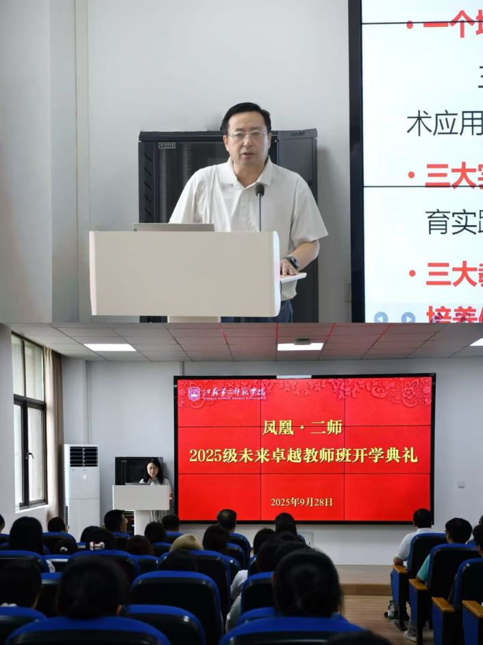 9月28日下午,2025级“凤凰·二师未来卓越教师班”开学典礼在石湫校区举行。我校党委常委、副校长皇甫立同,江苏凤凰电子音像出版社、江苏凤凰数字传媒有限公司副总编辑林雪,校教务处处长仇方道,质评处处长、教师教学发展中心主任顾晔峰,教育科学学院领导班子出席典礼。“凤凰·二师未来卓越教师班”班主任、辅导员以及两届未来卓越教师班的全体同学参加典礼。教育科学学院党总支书记丁莹主持。