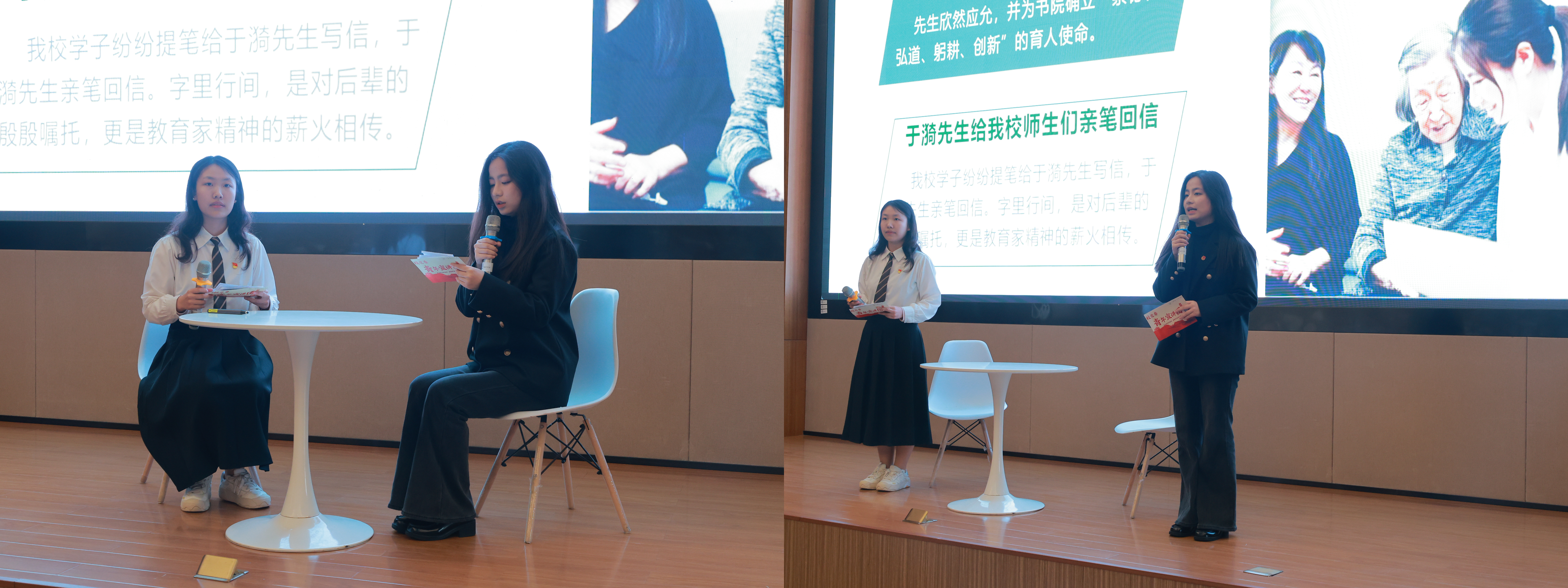传媒学院王贝琪同学曾于2025年5月随校领导赴上海看望于漪先生,并向于漪先生汇报了“永远的黄玫瑰——辛德贝格人道主义精神传承与传播”挑战杯项目。她分享了当时于漪先生认真倾听、频频点头,看完师生联名的汇报信后,亲笔写下“全身心投入立德树人工作,就会有永远奋斗前行的动力”嘱托时的场景。王贝琪同学感慨,这次拜访让她深刻领悟“教育是生命影响生命”的真谛,青年担当要落在实处,精神传承要代代延续。