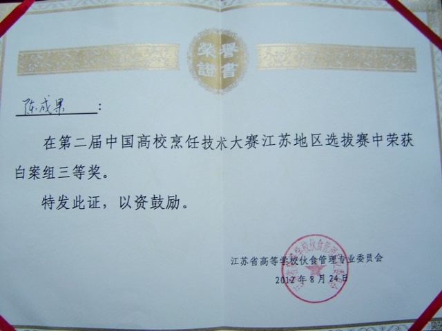 近日,在第二届中国高校烹饪技术大赛江苏地区选拔赛中,我院后勤服务总公司饮食中心员工陈成果取得了白案组三等奖的好成绩,同时也获得了代表江苏高校参加全国高校烹饪比赛的资格。