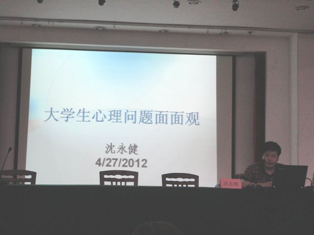 沈教授首先对高校各类自杀事件进行了点评。之后,从大学生心理要素入手,诙谐幽默、旁征博引地指出大学生普遍存在的心理问题。针对这些问题,沈教授以生动幽默的语言给我们讲解五类问题:1、人际交往;2、恋爱情感;3、学习考试;4、情绪调节;5、人生定位。