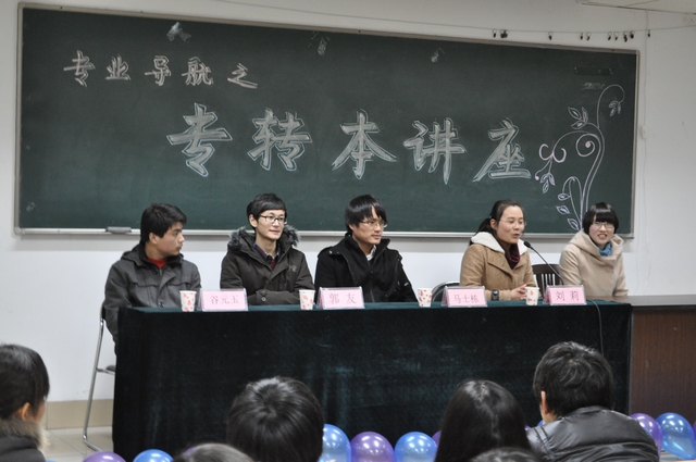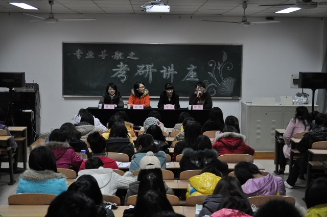 在考研讲座中,我院邀请了考取南师大,南大,南农大的四位同学来为我院大一新生进行考研讲座指导。首先,学长学姐就"大学的生活和学习"、"如何面对考研和找工作"展开了精彩的演讲。随后,"考研具体流程与注意事项"的介绍更是让同学们深入了解到考研的每一个细节。专转本讲座邀请了四位在去年专转本考试中取得了优异成绩的同学为新生讲解有关专转本的相关内容。首先,学长学姐向大一学生讲解了专转本考试中文科与理科的区别,让新生们在了解考试背景的前提下走好第一步。其次,学长学姐结合其亲身经历,由点到面的向新生介绍了有关考前复习的相关内容。在两场讲座的最后,新生们积极的提问与学长学姐们悉心的回答。