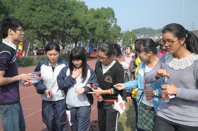 当比赛场地上有垃圾时,我快速上前捡起,扔进垃圾桶;当运动员摔倒时,我快速跑过去,搀扶着他向救护站走去,那里的医务室老师动作娴熟地帮他们的伤口进行消毒处理,并在院学生会实践部、红十字和青协同学的配合下对伤口做简单的包扎。