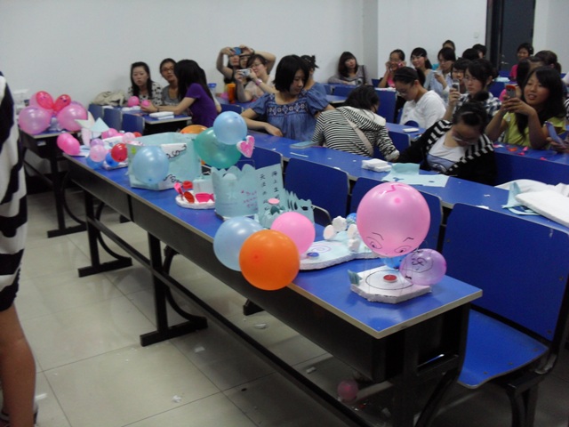 新生们早早来到教室,等待他们进入大学的第一次班级性的娱乐活动。学生会组织部事先已将制作河灯的材料准备好,鼓励新生们现场制作河灯。制作过程中,同学们团结协作,每个人负责不同的工作,有的折纸,有的画画,有的切割泡沫板,有的吹小气球。终于,当一个个河灯被排列在讲台前时,大家都惊叹于同学们的想象力和创造力。随后,中文系学生会各部门负责人担任评委,给同学们的作品进行打分。最终,一个莲花形状的河灯脱颖而出,荣获第一名。