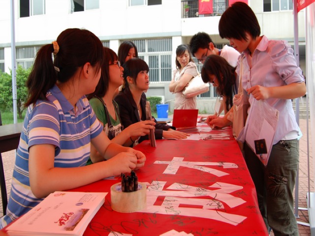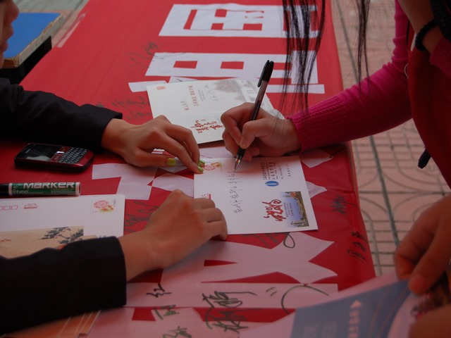 值此中秋佳节和教师节来临之际,学通社在迎新活动中,大打亲情牌,开展"我给恩师寄'片'情"活动。在同学们的笔下,每一封明信片都传递着一份祝福,寄托着一片情意。此外,我社还倡导新生在印有"立志成才,报效祖国"字样的横幅上签下自己的名字。红色的横幅承载着我社对所有新生的美好祝愿,密密麻麻的签名下则流露出新生对未来人生的美好憧憬与无限向往。