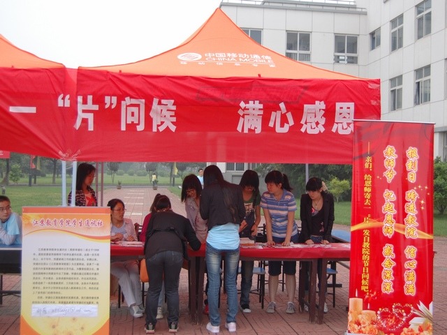 习习秋风,伴随着阵阵细雨,唤来了又一个清晨。天刚蒙蒙亮,江苏教育学院浦口校区南门前的广场上早已活跃起来。我们学通社的成员们也已齐聚于此,搬桌子、挂横幅、布置场地……按照既定计划,一切进行得有条不紊。