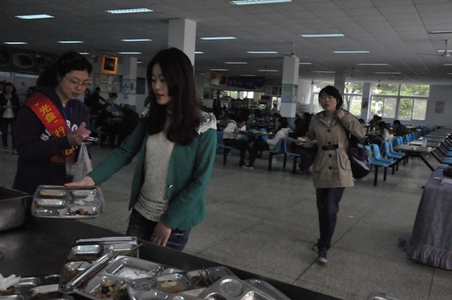 草场门校区的“光盘”行动从4月18日开始,至24日结束,主题为“‘光盘’行动,你我同行”。午饭期间,学生志愿者给就餐的学生分发印有“光盘”行动宣传标语的小纸片,并为饭后“光盘”的学生送上一份奖励纪念品,以鼓励他们再接再厉,养成勤俭节约的好习惯。
