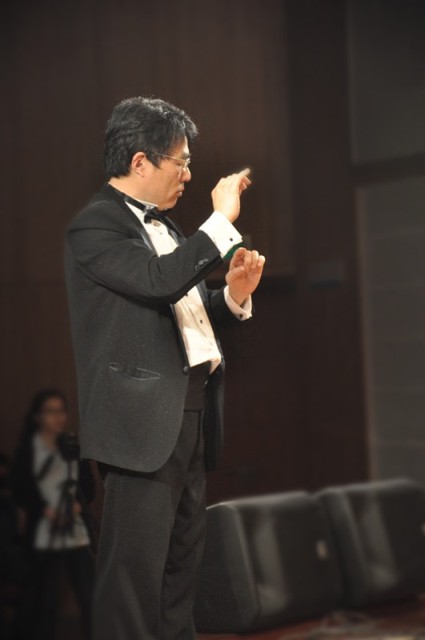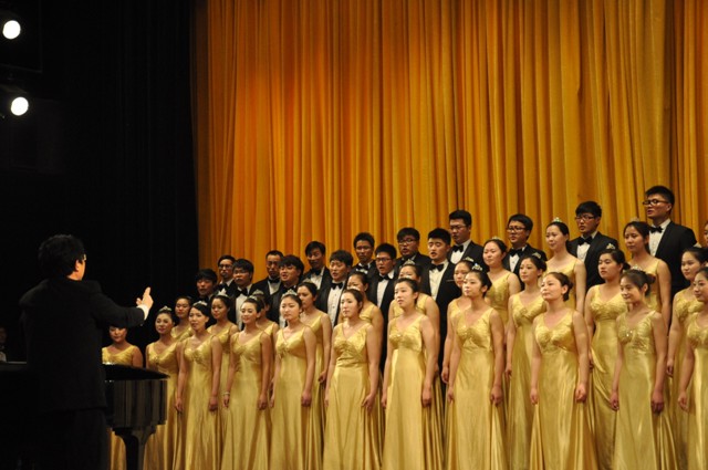 来自省属单位的12支参赛队齐聚一堂,台下座无虚席。每个参赛队演唱两首曲目,他们或古典,或流行;或优美,或激扬……可谓高手如云,异彩纷呈。我院代表队第八个出场,女生金色的裙摆,男生优雅的领结,指挥韩德森老师一身黑色西装,端庄中又不失朝气。和谐的声音由弱渐强,高低变化,或急或缓,指挥将自己对乐曲的理解通过肢体语言传达给同学们,再由同学们用声音演绎出来。长时间的训练使得师生间的交流感和同学们的声音达到了很好的契合度,将《在森林里》、《香格里拉》两首不同风格的作品诠释得淋漓尽致!两曲终了,场内掌声雷动!