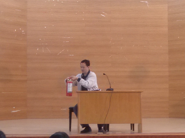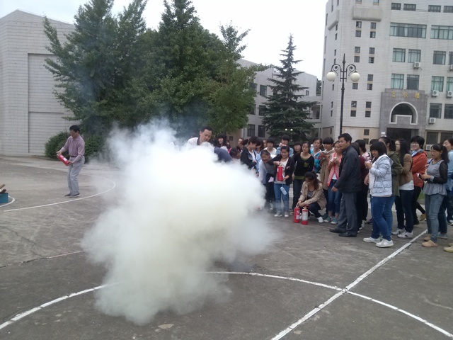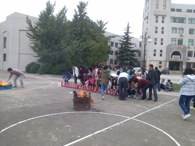 活动分三个部分进行,首先是保卫处工作人员进行消防基本常识讲解,他介绍了灭火器的种类及各种灭火器的特点,并亲自示范了灭火器的使用方法等。随后进行了火灾现场疏散演习,二号楼宿舍的女生们参与演习。最后在篮球场进行了初起火灾的扑灭演练。整个过程井然有序,大家配合默契。