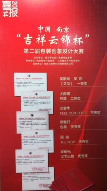 由南京市广电新闻出版局主办,南京包装行业协会和江苏省文化产权交易所联合承办的中国南京“吉祥云锦杯”第二届包装创意设计大赛刚刚落下帷幕。美术学院学生吴嗣光、吴凯的作品《又见》荣获一等奖;尤南琪作品《包装》荣获二等奖;沈宴华作品《