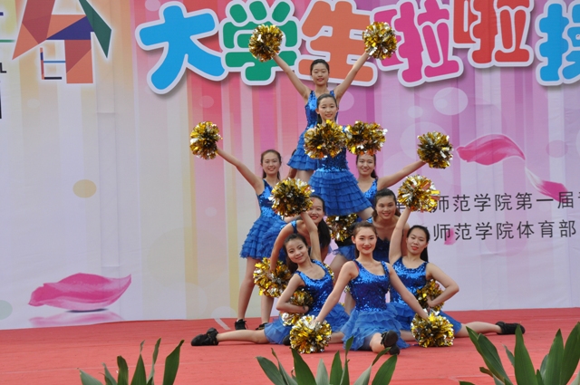 来自十三个学院的十九支队伍参加比赛。统一的着装、靓丽的身姿、动感的节奏、变换的队形、极具震撼力的技巧,处处彰显着当代大学生的蓬勃朝气。现场观众的加油助威声不断,将操场变成了青春与欢乐汇聚的海洋。最终,音乐学院、外国语学院、现代传媒学院、学前教育学院分获固定套路和自选套路一等奖。