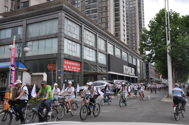 5月24日上午,我院70余名青奥志愿者从草场门校区体育馆出发,骑行十余公里,前往南京青奥组委会总部——南京绿博园,开展“活力二师——火炬伴我行”主题骑行活动,通过这一独特的方式进行青奥宣传,展示志愿者风采。