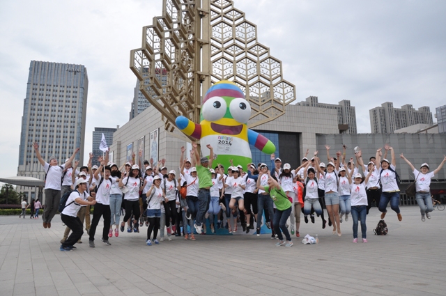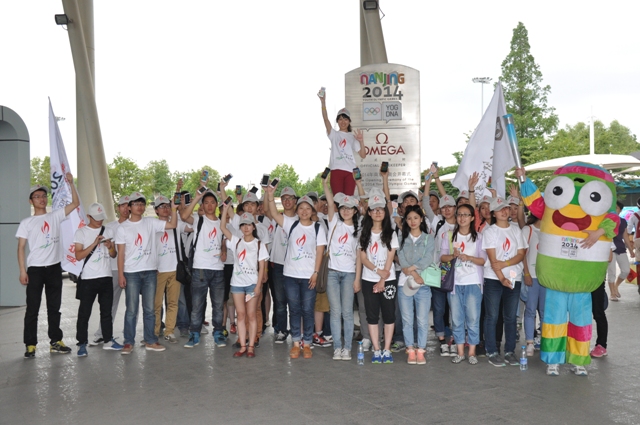 到达绿博园后,全体志愿者在组委会工作人员的引领下,有序参观青奥组委会总部;通过APP“南京2014”虚拟火炬传递系统,以线下虚拟的方式现场进行火炬传递,并指导过往行人下载使用;在吉祥物砳砳的带领下,向过往游客派发青奥手环和砳砳贴纸。