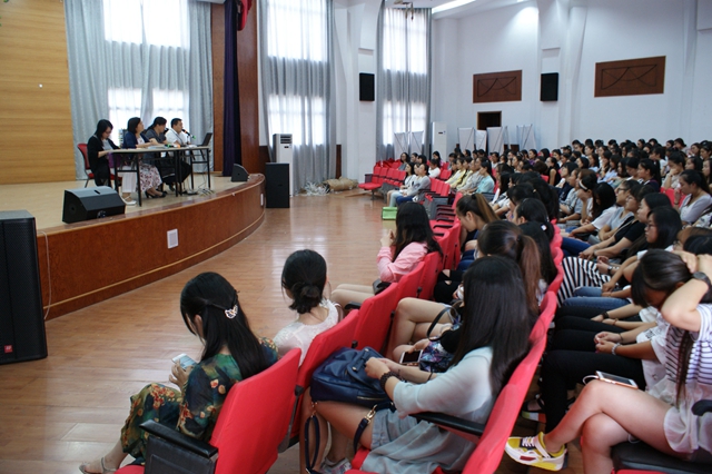 王玲玲致欢迎词。她详细介绍了该院的师资力量,给同学们作了大学生活的引导,并对大家提出了新的要求和期待。尹坚勤解读了学院的一些具体事项,强调了课堂纪律和学校管理制度。徐群和田燕对大家进行了专业导航,引导新生如何利用好时间,将大学生活过得更加精彩。转本班的孙烨同学和普本班的徐亚蓝同学代表新生作了发言。
