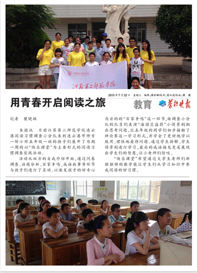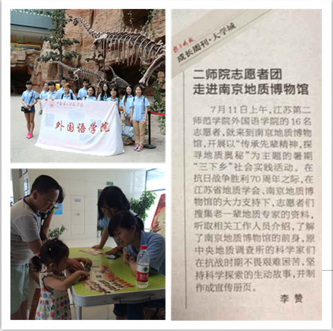 7月份,团委以“践行‘八字真经’,投身‘四个全面’”为主题,组建17支暑期社会实践小分队270余名学生志愿者分别奔赴南京、苏州、常州、淮安、南通、泰州、无锡、连云港等多个市、区、县开展了为期一个月的文化、科技、卫生“三下乡”大学生社会实践活动。