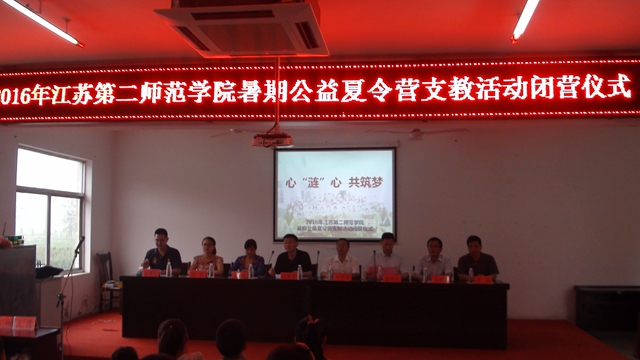 7月15日,我校2016年“心‘涟’心,共筑梦”暑期公益夏令营支教活动圆满结束。该活动闭营仪式在涟水县灰墩办事处举行,涟水县委副书记、省委驻涟帮扶工作队队长孙国君,我校党委组织部部长刘守旗,经济与法政学院党总支书记、副院长王曦,经济与法政学院副院长成谢军,团委副书记刘姝,灰墩办事处主要负责同志以及全体夏令营营员及家长一百五十余人参加仪式。仪式由灰墩办事处党委副书记(我校挂职)眭春良主持。