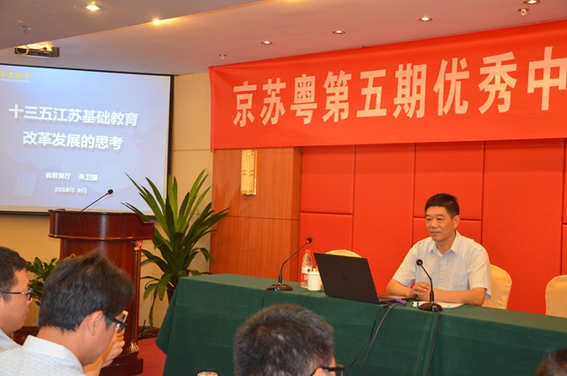 江苏省教育厅副厅长朱卫国为三地的学员作了题为《“十三五”江苏教育改革与发展的形势与任务》的首场讲座。