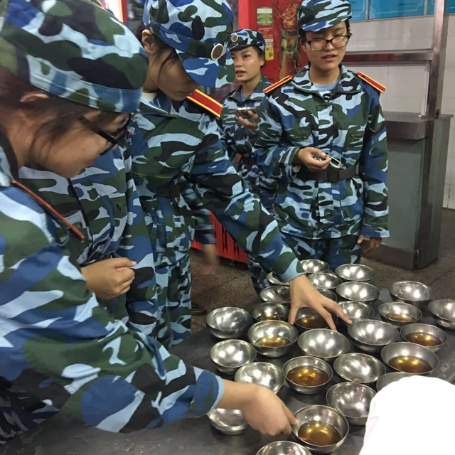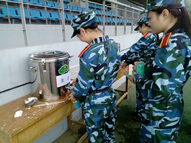 军训办请食堂师傅熬制了姜汤给同学们暖身