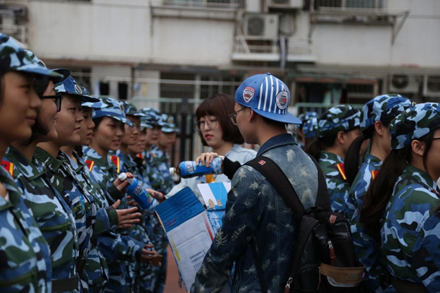 学长学姐带着大包小包的水和食品为“小鲜肉”军训加油助威