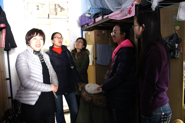 2016级新生宿舍,了解宿舍生活安全情况,关心困难学生,特别是外省新生,询问其校园生活适应情况和寒假火车票购买情况,并叮嘱同学们遇到困难要及时向辅导员、班主任反映。