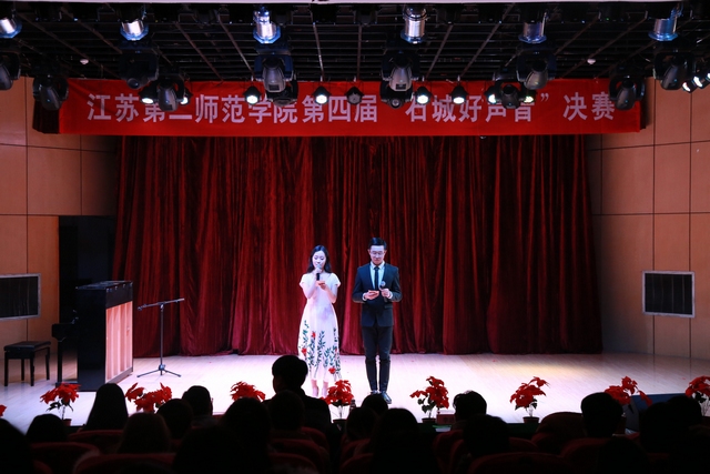 12月15日晚,由党委宣传部主办,学生广播台承办的江苏第二师范学院第四届“石城好声音”决赛在草场门校区艺体楼四楼演奏厅举行,来自三校区的16名选手经过海选的层层选拔,最终决出了前三名。