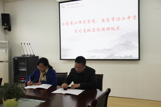 4月11日下午,我校外国语学院与南京市沿江中学举行教育实践基地签约授牌仪式。教务处处长徐新萍,资产经营总公司总经理赵俊,外国语学院党总支书记、副院长张莉和党总支副书记黄晓波出席仪式。沿江中学副校长冯大庆主持仪式。
