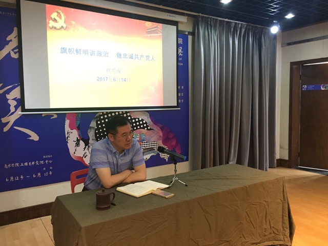 为进一步贯彻落实中央、省委和学校党委关于“旗帜鲜明讲政治”的学习宣传要求,按照学校“两学一做”学习教育计划安排,近日,副校长祝兴成给资产经营总公司和美术学院党总支全体党员作了题为《旗帜鲜明讲政治,做忠诚共产党人》的专题报告。