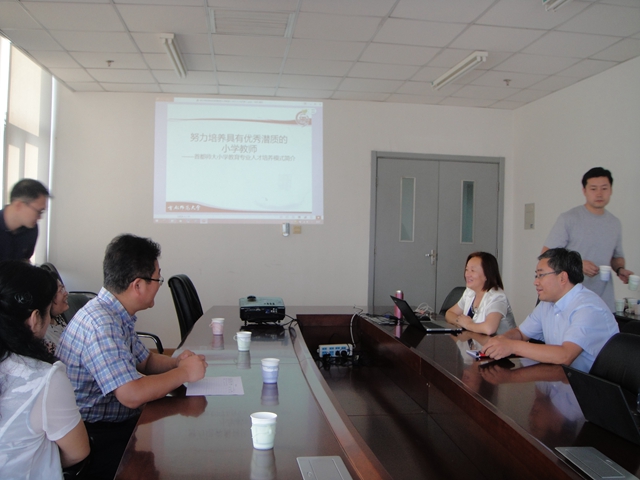 陈国庆一行与首都师大初等教育学院副院长刘慧、党总支书记张润杰以及各教研室主任进行了深入的座谈,刘慧详细介绍了该校小学教育专业人才培养模式,并对我校教育科学学院的专业建设提出了切实的建议。陈国庆一行还参观了该校初等教育学院、心理学院的专业实验室。