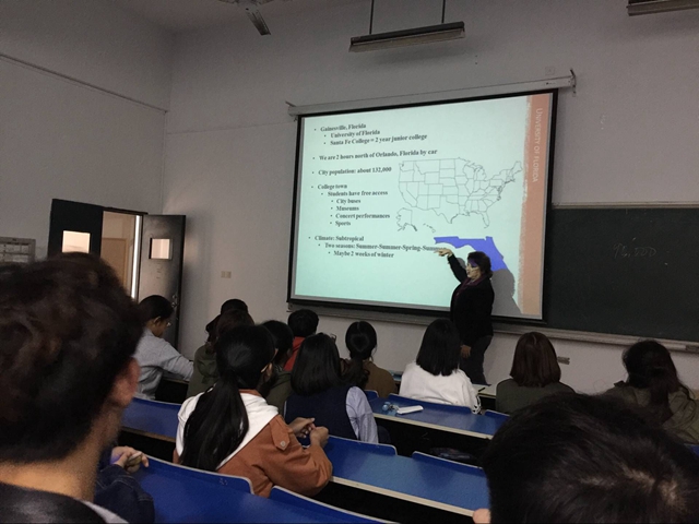 Jo博士详细介绍了美国佛罗里达大学的校史、学校规模、校园建设以及学校的周边环境等,向同学们解释了我校和佛罗里达大学开展的“3+1+1”项目,即:前三年在我校学习,申请并符合要求的同学在大四这一年赴美国佛罗里达大学进行交换学习,完成相应课程达到相关要求之后取得我校毕业证书和学位证书,可以优先申请美国佛罗里达大学的硕士研究生学习。Jo还就学生关心的在美期间的学习内容、学位获得以及美国大学生活作了详细讲解。