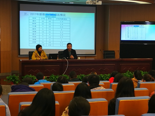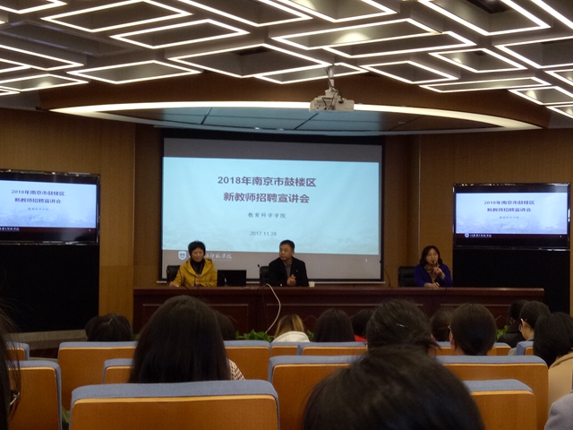 11月28日,教育科学学院邀请南京市鼓楼区教育局来校为毕业生开设2018年度教师招聘宣讲会。鼓楼区教育局徐冬梅科长、教师发展中心杨杰军副校长出席并作宣讲。教育科学学院副院长陈国庆、党总支书记王玲玲、副书记张志行全程参与。