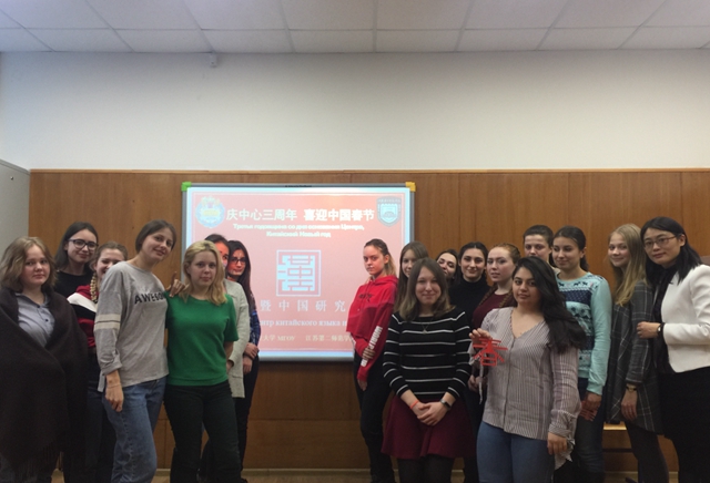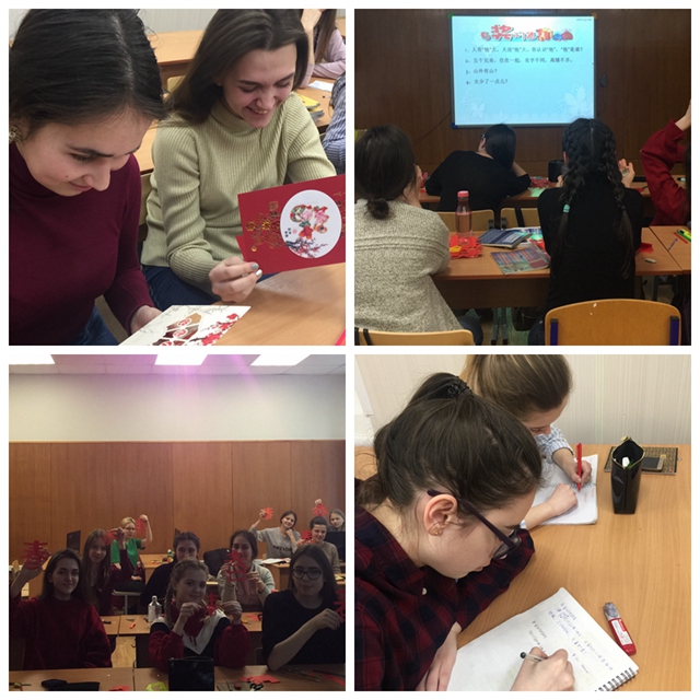 为庆祝我校与俄罗斯莫斯科州国立大学共建的汉语暨中国研究中心成立三周年及中国春节,2月23日,该中心组织了联欢活动。活动内容丰富多彩,有介绍春节习俗、欣赏中国新年贺卡、学写新年贺卡、剪中国“春”字、唱中国歌、猜字谜等,还举行了一项创新型庆祝活动——在社交网上集体庆祝,用汉语向大家说出自己祝福的话语。 这些活动增进了该校学生对中国的了解,也增强了学生学习汉语的兴趣。