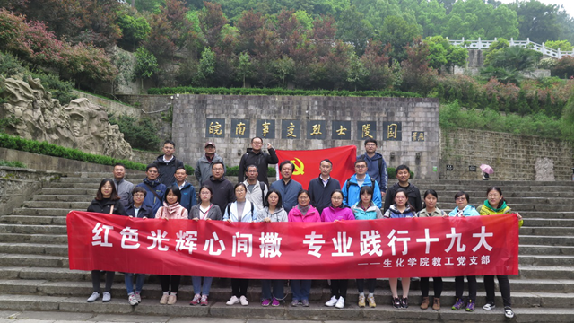 4月14日,生化学院党支部赴安徽泾县开展“红色光辉心间撒,专业践行十九大”主题党日活动。党总支书记陈建琴、院长蒋功成、副院长花书贵、朱学伸、教工支部书记杜攀及支部党员、教师代表参加活动。