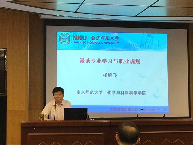 5月16日下午,生化学院邀请南京师范大学化学与材料科学学院博士生导师杨锦飞教授来院,为化学专业学生作了一场“化学类本科专业学习与职业规划”的专题报告,生化学院副院长花书贵主持报告会,生化学院部分专业教师出席。
