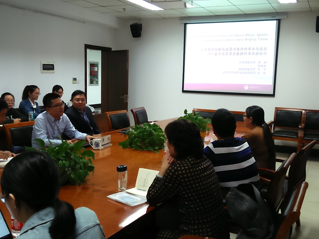 黄斌教授作了题为《义务教育均衡化政策对房价的资本化效应》的学术报告。他利用价格模型诠释了在现代生活中,由于家庭财富的居住区分产生的名校效应导致学区房价格不断上涨,最终引起教育不公的现状,分析了国家提出的供给侧、需求侧的改革政策不能完全改变教育的资本化的问题。