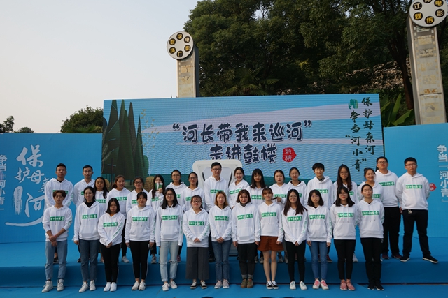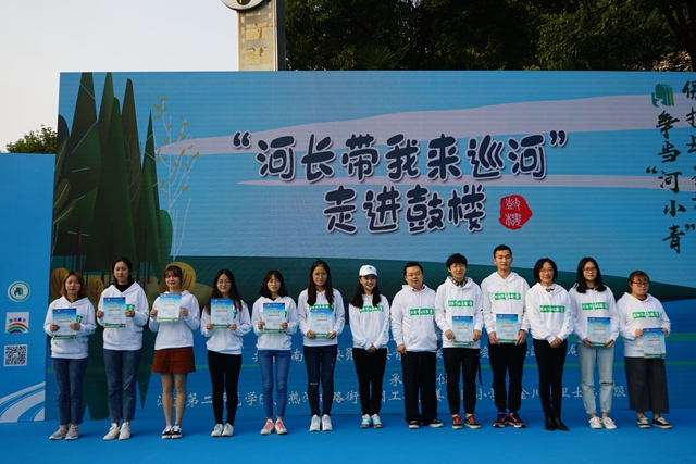 在活动启动仪式上,南京团市委副书记石磊宣布“河长带我来巡河”走进鼓楼活动正式启动,鼓楼区水务局局长徐晓华介绍了鼓楼全区水环境治理情况,并为鼓楼区“河小青”志愿服务总队、“河小青”红领巾志愿服务队授旗。我校生化学院江豚协会郑迅同学代表所有志愿者宣读“保护母亲河·争当河小青”环保行动倡议书。