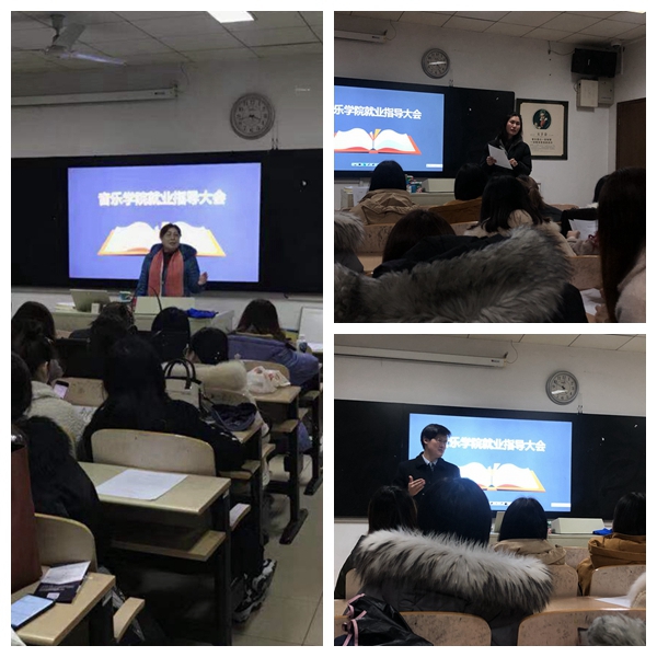 2月20日、21日下午,音乐学院分别在草场门校区艺体楼202教室和206教室,召开2019届毕业生就业指导大会。本次会议由院党总支书记蒋向红主持,段宝君老师、肖圆圆老师、周乐老师和全体毕业生参加会议。本次会议的重点是作就业动员,并对各项事宜作相应指导。