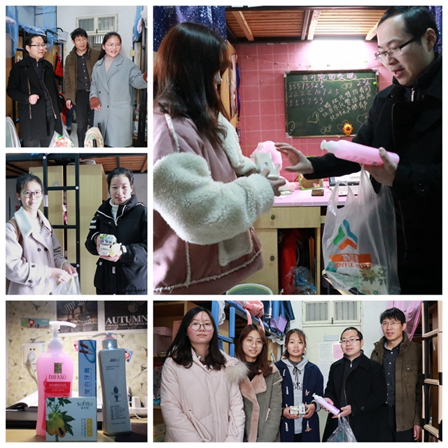 本次活动共走访了该院16、17、18级共12个女生宿舍。在到访宿舍,张志行表达了学院对贫困同学的关心和关爱,送上精心准备的节日礼物,系列的洗化用品。他与同学们进行了亲密交谈,亲切询问了她们的学费来源、日常消费支出、课余生活、学业规划等方方面面,勉励贫困同学要刻苦学习,通过优异的成绩获得最终的素质提升,从而提升就业竞争力。学生党员对相应的经济困难学生进行了现场结对,强化了服务导向。被访的每个宿舍干净整洁,宿舍文化各具特色,学习氛围浓厚,显示了建档立卡同学的良好的精神面貌和该院的宿舍文明概况。