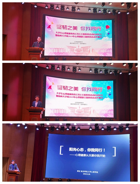 在启动仪式上,江苏省教育厅副厅长苏春海、南京师范大学校长陈国祥分别致辞。南京师范大学傅宏教授作题为《阳光心态,你我同行》的专题讲座。为更好地展示各高校心理健康工作中的特色,来自南京的22所高校还参加了当天下午举行的广场展示活动。我校由美术学院和心理健康协会同学共同策划的“心·印象”心理主题绘画活动在现场受到了各兄弟高校师生的积极参与和广泛好评,在普及心理知识的同时,促进了校际交流。