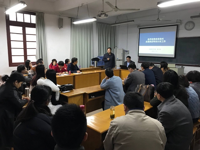 随后,陈玉祥给该院全体教师作了题为《自评自查自省自纠 全面推进专业认证工作》的辅导报告,重点围绕专业认证理念、专业认证准备两方面进行了讲解说明。他详细介绍了专业认证材料准备的五大模块:教师准备、学生准备、自评报告准备、佐证材料准备及实验室准备。他有针对性地对小学教育专业人才培养方案的优化,课程教学大纲、试卷命题组卷、毕业论文等重要环节提出了宝贵的意见。