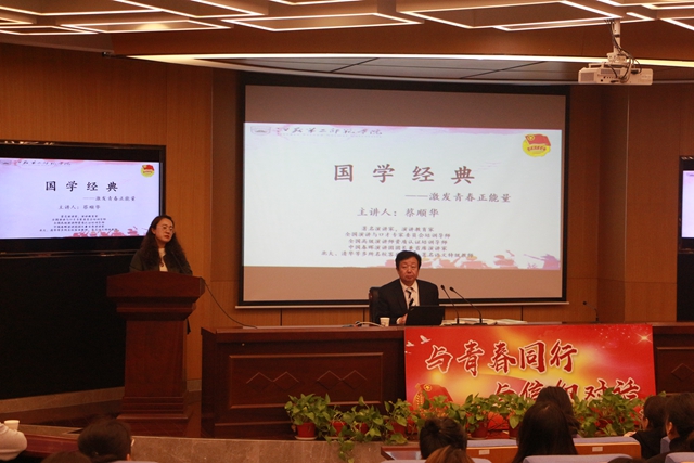 3月27日晚,团委邀请著名演讲家、教育家,全国教育系统劳动模范,国家人民教师奖章获得者蔡顺华先生来我校,为两百多名师生作了题为《国学经典——激发青春正能量》的精彩讲座。讲座由校团委副书记刘姝主持。