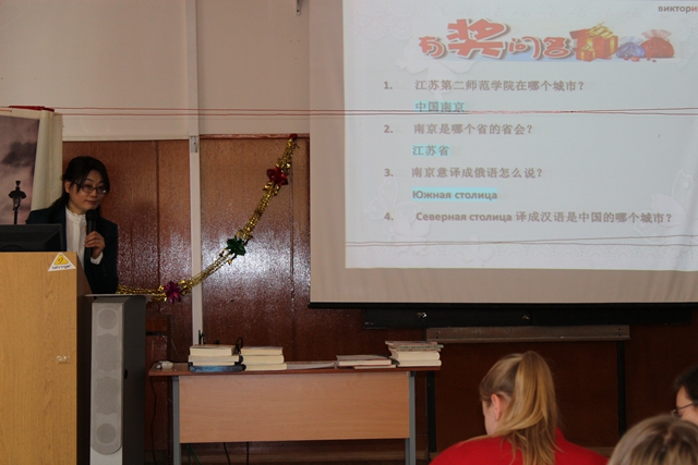 莫斯科州国立大学图书馆工作人员奥莉佳首先介绍大学图书馆中跟汉语相关的书籍。接着,汉语暨中国研究中心俄方主任塔季扬娜介绍中心书籍及中心要举办的活动,中方主任翟洪云则重点介绍了江苏第二师范学院和中国南京。
