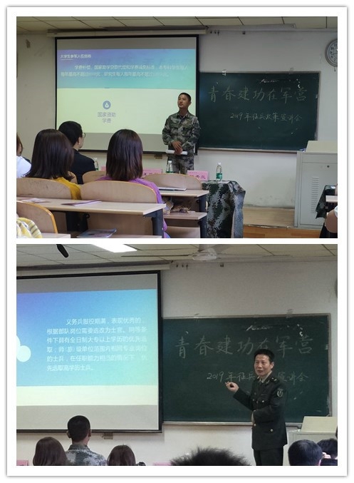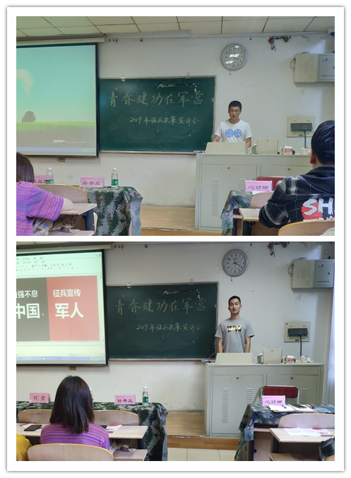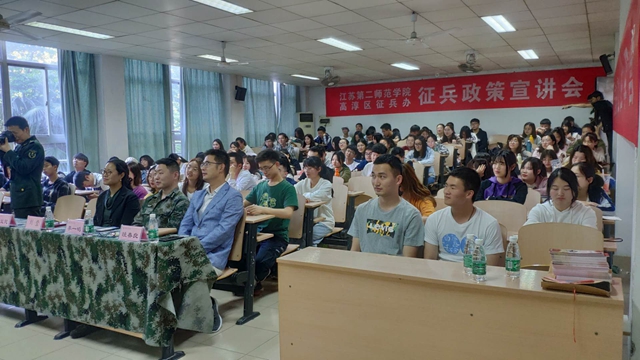 高淳区征兵办王益民参谋、孙秀兰干事担任主讲并回答了学生的提问。宣讲会后,生命科学与化学化工学院17级小学教育(科学)专业的葛东雷同学和教育科学学院18级小学教育专业的许雨志同学作为退役大学生代表与现场110余名学生分享了他们的从军经历。同学们备受鼓舞,从军热情高涨。